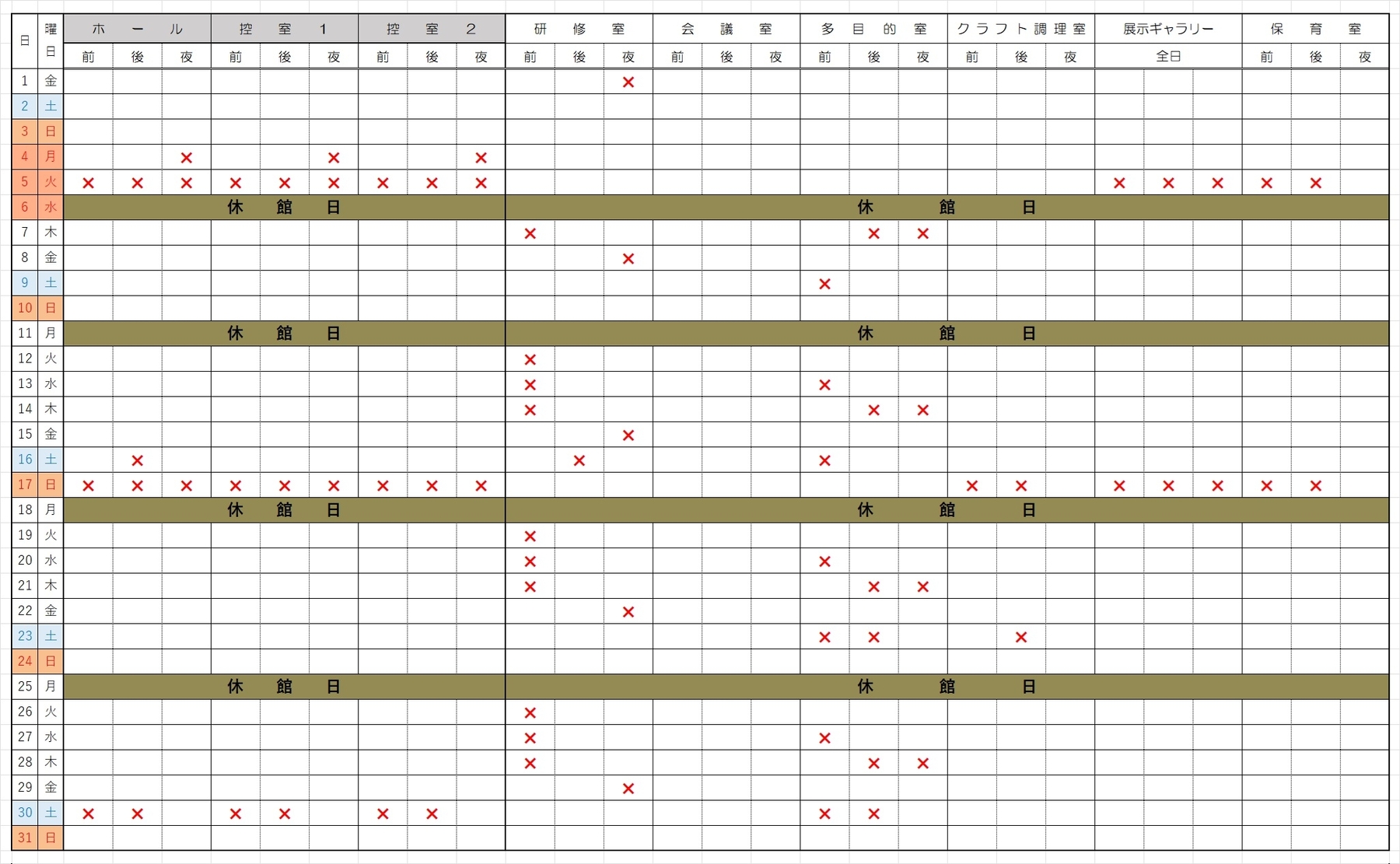 空き状況は、2025年10月26日(日)14:00時点のものです。抽選が終了した日程の空き状況については、センターまでお問合せください。