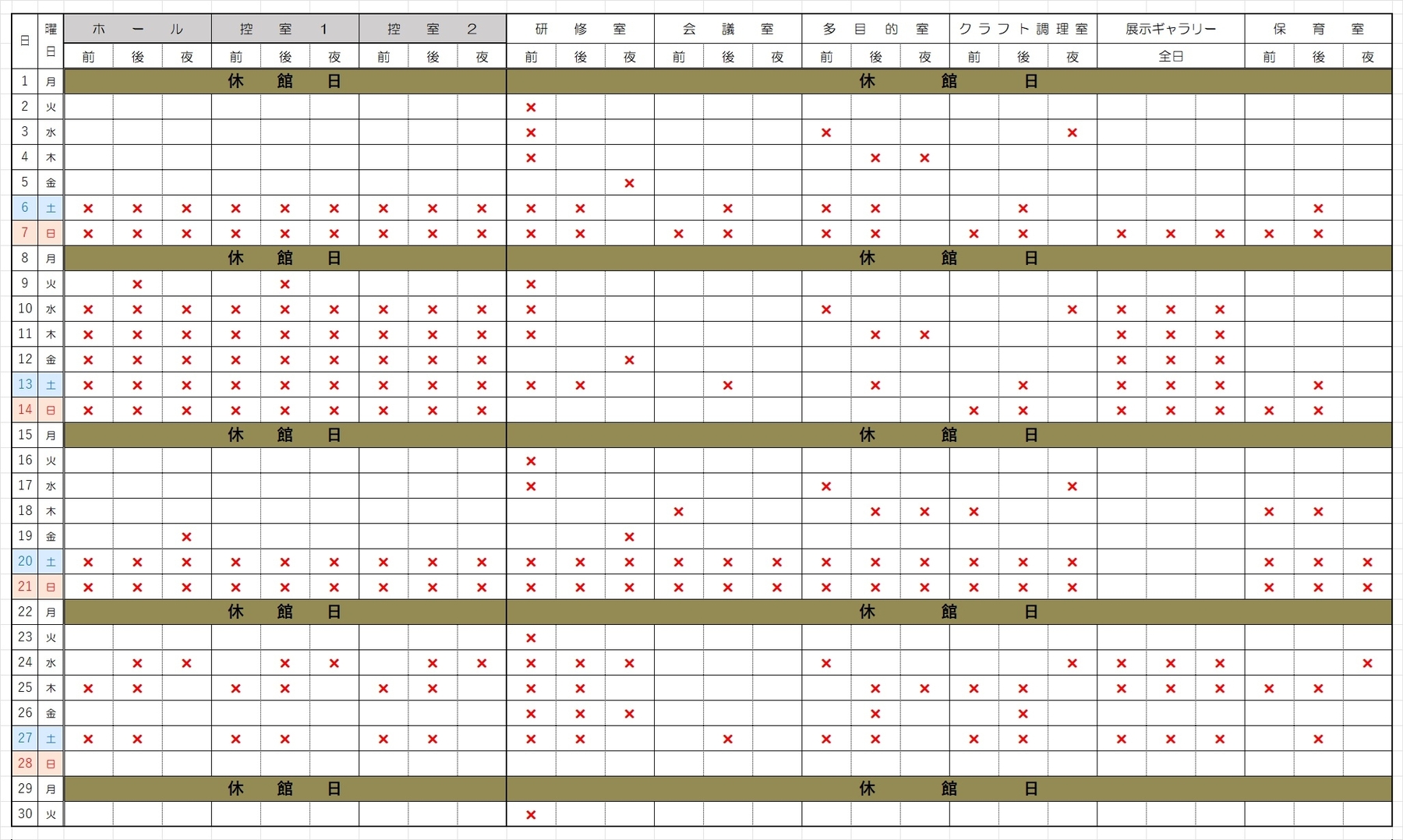 空き状況は、2025年11月26日(水)14:00時点のものです。抽選が終了した日程の空き状況については、センターまでお問合せください。